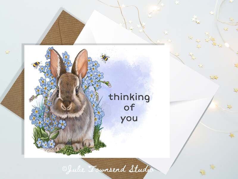 Note Card Set - Sweet Bunny and Forget-Me-Not Flowers - Thinking of You Cards - Set of 10